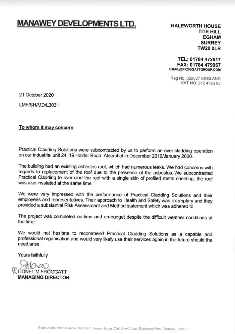 I have no hesitation in highly recommending this company to others requiring a practical cladding solution.